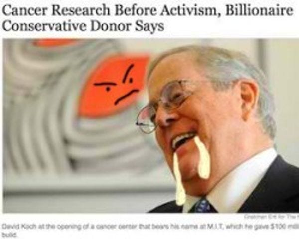 That would be the LIBRUL media, duh, only don't worry! According to an attendee of the annual crotchety villain conclave in Aspen, the Koch brothers do not want to eradicate the competition; they just want to "make sure their voice is heard." Comforted? We are! Or then there is this blatant lie:
