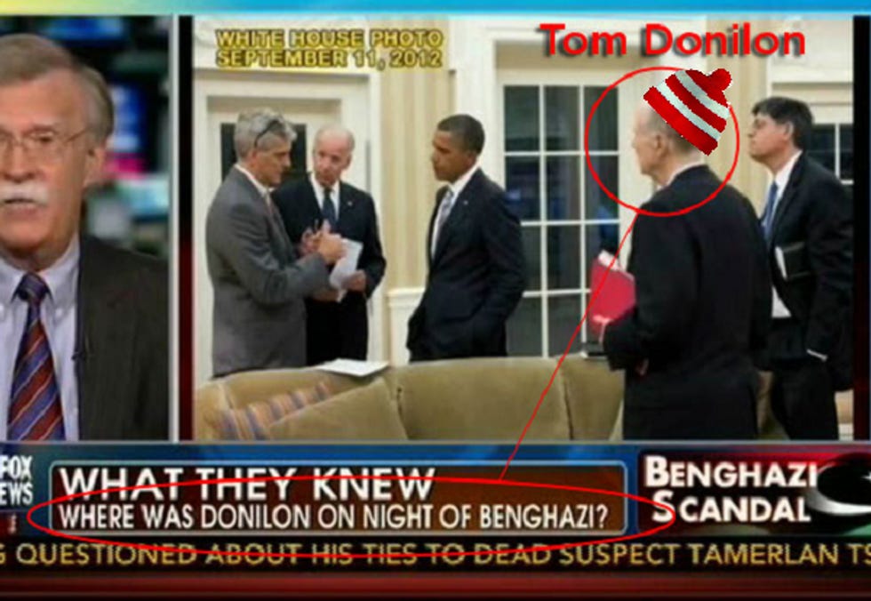 Oh, golly, kids, did WE ever get an assload of butthurt feedback from Wingnut America after our piece Thursday about Benghazi and Fox News's continuing search for the Real Killers! As you may recall -- or not, depending on that little "late afternoon blackout" problem of yours -- Fox's Brian Kilmeade wondered just where the hell national security adviser Tom Donilon was during Benghazi -- over a photo showing Tom Donilon standing in the Oval Office on September 11.