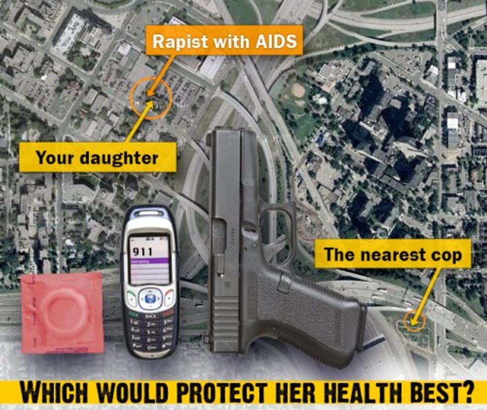 Yes, "Rapist with AIDS," and you are not even watching an episode of Family Guy. There's also a pregnant lingerie-clad bride on an ad for a gun range, makes sense to us!