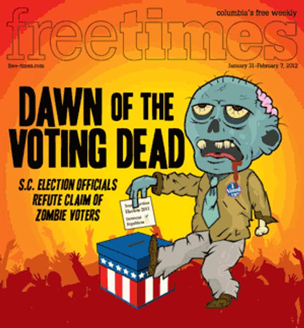 Zombies are all the rage these days, from the video games kids are playing to teevee shows and movies, you can’t go anywhere to escape them. Not even the voting booth, according to South Carolina lying liar Attorney General Alan Wilson. From the Columbia Free Times: