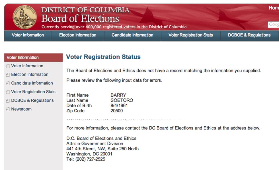 Which of course just proves that Barry Soetoro and his gang of Indonesian thugz have gotten to the DC Board of Voting And Whatnot just like they got to the IRS, and made them take down the voter registration proving that Barry Soetoro Hussein Hitler Lenin Stalin Castro Mao Che is actually a foreign citizen who does vote fraud from his own address, one alias at a time.