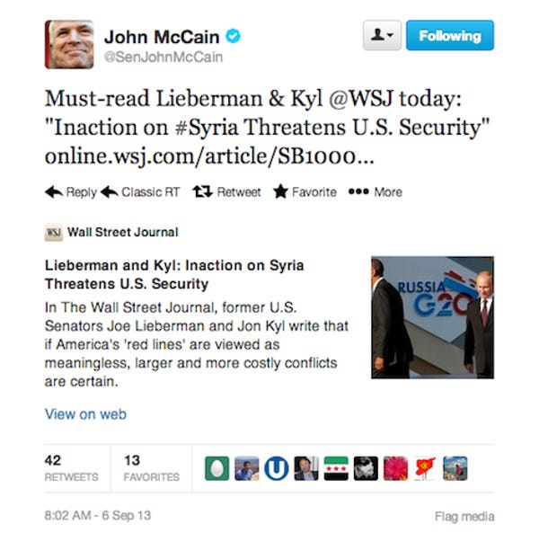 John McCain has always wanted war with Eastasia. Er, Syria. Whatever. If there is a war to be had, you know McCain wants it. In fact, he was calling for "renewed focus on what partial military operations might be considered to protect civilian lives in Syria" back in 2011, before it was cool. He's a trendsetter.
