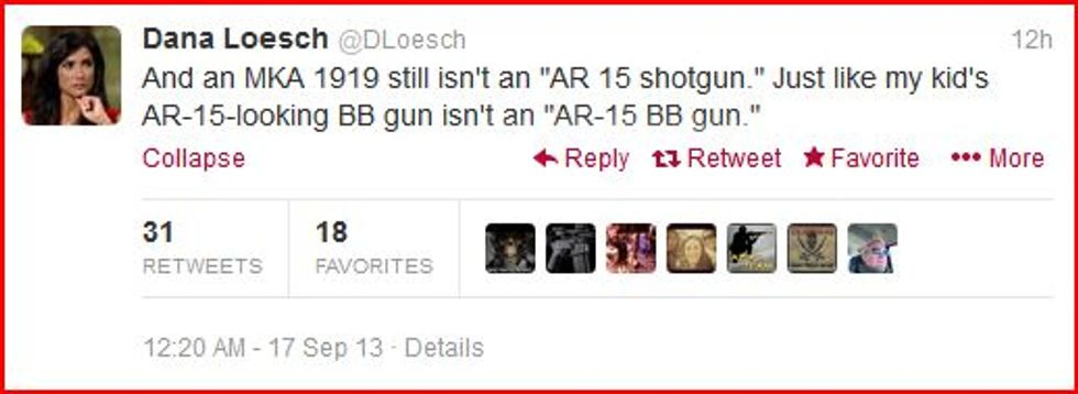 Then the earth spun once around its axis, and the thinkable happened: a lunatic shot a bunch of people, again. But Dana Loesch was ready. Immediately she took to Twitter in a valiant effort to ensure nobody was wrong about what kind of gun the lunatic was using: