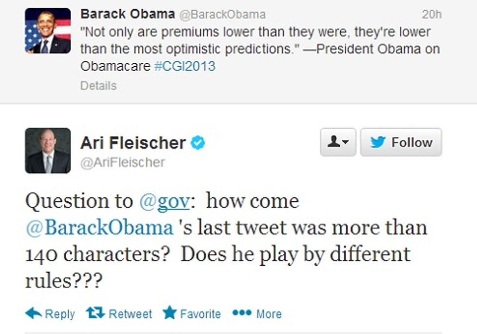 Yeah, how come Barry gets to use 136 characters when we only get 140? Hm, wait, that is less? Oh, Ari Fleischer it is so unlike you to be wrong all the time. It would have been a terrible thing if President Obama was hoggin up all the tweet characters, in some bizarre propagandistic sub-plot by twitter to make us all socialists. But instead you just cut and pasted the whole tweet to a word doc and included the @BarackObama and the auto-count screwed you over. Thanks a lot Obamacare.
