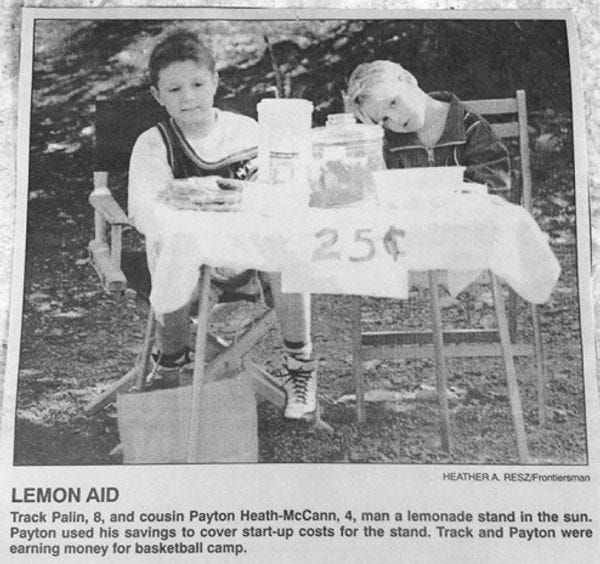 On her FaceSpace page yesterday, Sarah Palin posted this photo of her son and nephew from about 15 years ago, gettin' all mavericky and free-enterprisey one summer. She had this note: