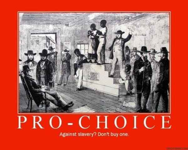 The Republican Party of Chisago County, Minnesota, posted this awesome satirical image on its Facebook page for a few hours Wednesday, then removed it -- and the entire Facebook page, for a while -- before posting an apology, saying that the posting was "not representative of our party." Aw, come on, guys, enough Republicans have said that the attempt to ban abortion is exactly like the 19th-century abolition movement that you don't need to apologize. After all, isn't that exactly the hilarious point of the post, that legalized abortion is just as morally reprehensible as legal slavery? If anything, liberals should apologize for the slogan that inspired the Chisago GOP's amusing spoof, because choosing not to have an abortion while allowing abortion to remain legal for others is exactly like choosing not to own a slave while slavery as an institution continued, amirite?