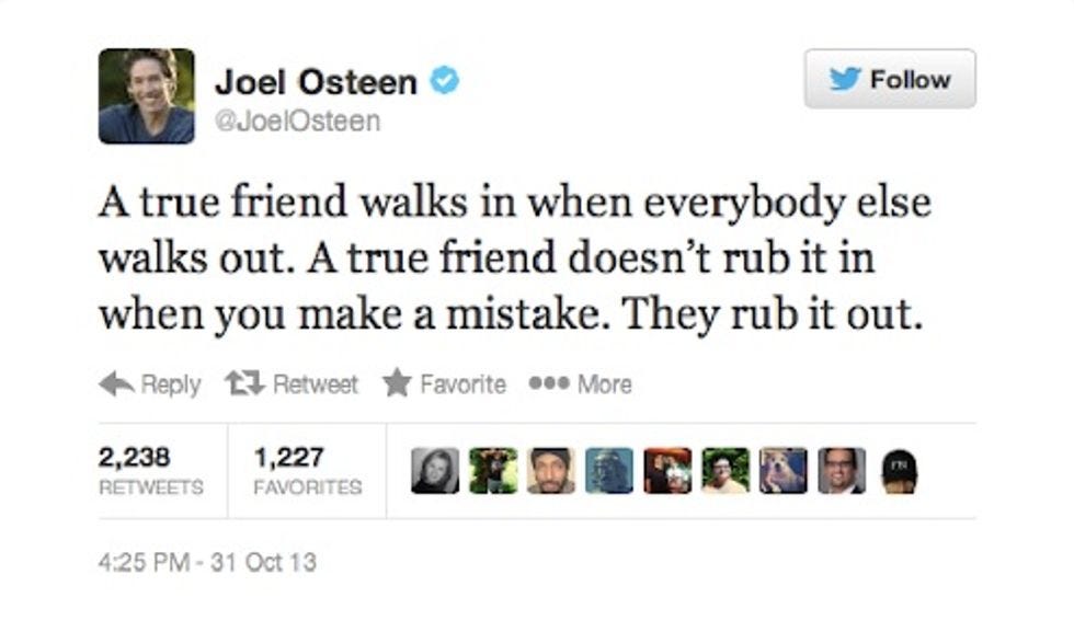 Gawker found this inspiring advice from motivational speaker Joel Osteen, which has for some reason since disappeared from his twitter feed.