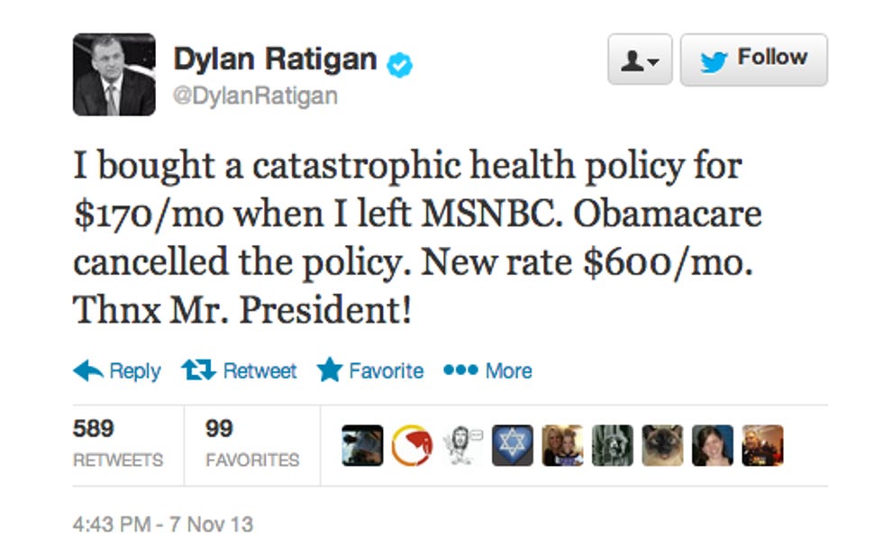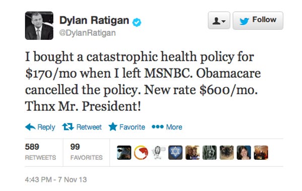 Git out yer pitchforks, socialist dictator Barack Obama is redistributin' yer wealth by making former millionaire MSNBC personality Dylan Ratigan pay AN EXTRA FOUR THOUSAND DOLLARS A YEAR for health insurance, because the old one he bought -- his $170 per month catastrophic "insurance" -- done been canceled. (And who canceled it, according to Dylan Ratigan? OBAMACARE CANCELLED IT, case closed!)