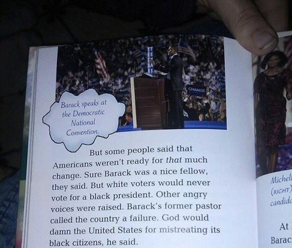 Fourth graders in Dupo Illinois are reading a biography of Barack Obama by author Jane Sutcliffe. The book teaches children that white voters rejected Obama because of race.