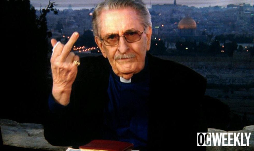 On a somewhat related note, televangelist Paul Crouch, the founder of the Trinity Broadcast Network (pictured above giving the finger to his camera crew in a reportedly undoctored photo), died Saturdayat the age of 79. Crouch built a broadcasting empire and well-beyond-comfortable lifestyle on viewers' "love offerings," and his enthusiasm for the Lord led some jealous souls to sue him and his hyper-bouffanted wife Jan over important ministerial purchases like a $100,000 motorhome for their dogs , plus there was that one time when Crouch paid a gentleman friend $450,000 to just shut up about the gay sex already.