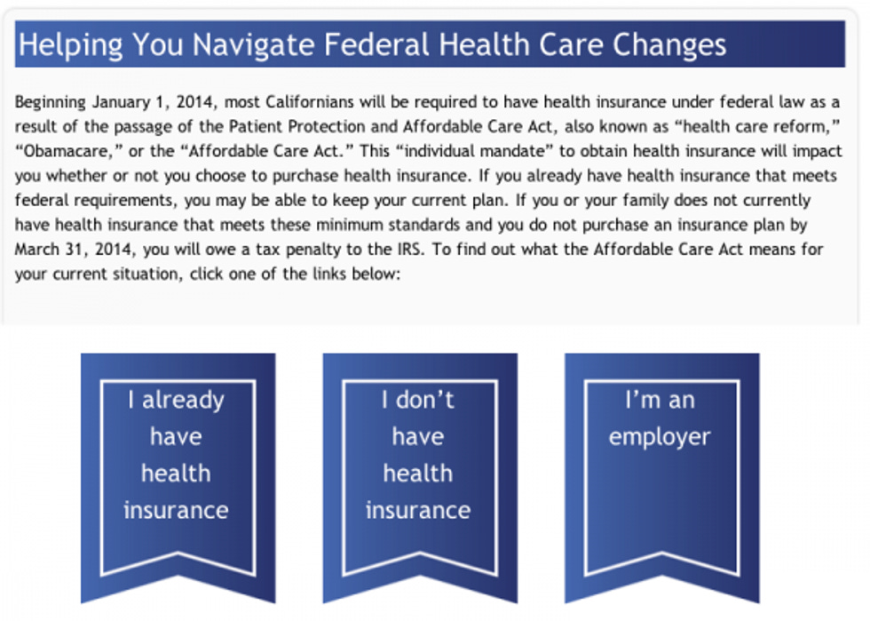 And so on. People who don't have insurance will find some actual information, but the largest feature on that page is a rate calculator -- not a calculator for insurance premiums, but for the IRS penalty that you will have to pay if you don't get insurance. As far as what kind of insurance is available, readers are told