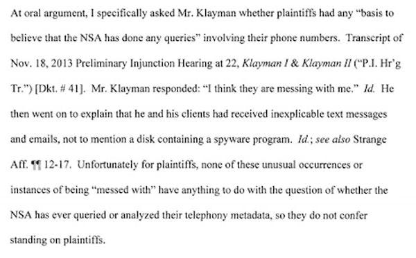 Also, the judge caught on kind of quick that the reasons that led to the Klayman Krew believing the government was going all The Wire on them were a bit slapdash aka completely ridiculous.