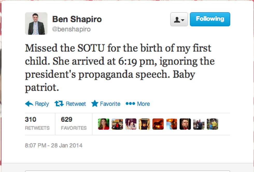 Ben Shapiro Maximizes Efficiency By Greeting Newborn Daughter, Sneering At President In Just One Tweet