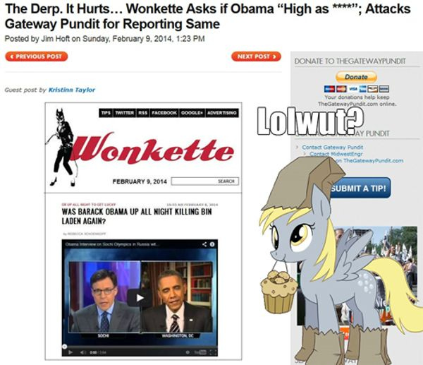 Still we have to give guest blogger Kristinn Taylor props for his gotcha here: "Wonkette acknowledges the hypocrisy but ran with it anyway because, well, Gateway Pundit." As incontrovertible proof, he cites this line from the Derp Roundup piece, in which we linked to the earlier Wonket: