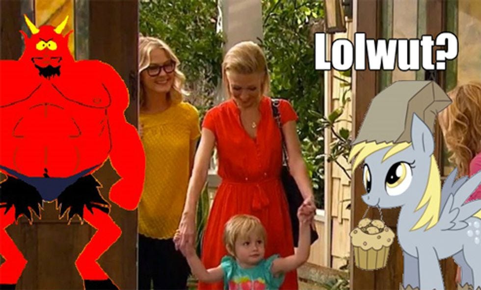 And then there's the ongoing rightwing freakout over a January 26 episode of a Disney Channel sitcom that we've never heard of called Good Luck, Charlie, which has been around since 2010 somehow. The episode featured a plotline in which the little girl of the family has a playdate with another girl who has two mommies, which the show didn't make a big deal out of. Pearls were fainted upon and couches were clutched, and the Usual Suspects proclaimed that the Disney Channel was no longer a safe choice for family viewing (which it never was -- with the exception of Gravity Falls, its programming is almost universally insipid). Pete LaBarbera, the head freak at "Americans For Truth About Homosexuality," called for America to adopt a Russian-style "Gay Propaganda" law to prevent Disney from "propmoting lesbianism to kids," all twelve ladies in One Million Momscalled for a boycott of the show's advertisers (but not of Disney itself, because maybe the Moms are tired of being laughed at), and some nice people sent death threats to the five-year old star of the program, who needed to be held responsible for her actions, we guess.And, a little late to the fray but timely enough for Derp Roundup, one of our favorite minor-league culture warriors, fired Navy chaplain Gordon "Chaps" Klingenschmitt, called for a Disney boycott and explained that Disney is infected with demonic spirits:
