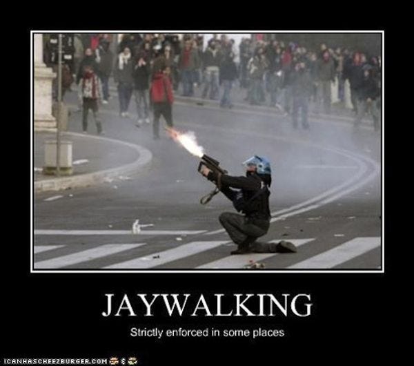 Last week, we learned of the detainment of America's most wanted criminal: a lady in Austin, Texas, who committed the terrible should-be-punishable-by-death offense of jaywalking, and then refused to provide her ID on account of not having her ID with her at the time. Naturally, the Austin police treated the matter with appropriate restraint by calling for reinforcement (instead, they got two bike cops), placing her under arrest, and throwing her in the back of the police car as she screamed that she'd done nothing wrong. Does this sound a tad extreme? Well, pffft and pshaw, because the police department was merely enforcing pedestrian and bike safety .
