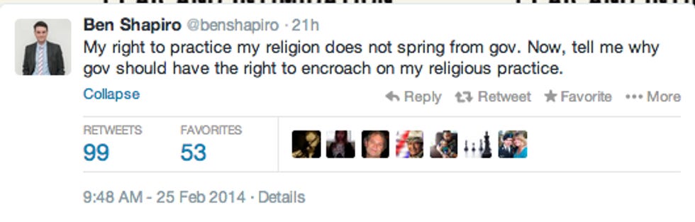 Anyway, Shapiro, who in addition to being the proprietress of Truth Revolting, is an attorney who graduated from Harvard Law School, had a Deep Thought on the tweeter about why is the government infringing on his religious right to refrain from gay cake baking. Here, have a twat!