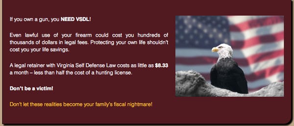 “A legal retainer with Virginia Self Defense Law costs as little as $8.33 a month — less than half the cost of a hunting license,” the firm’s Web site says. “Don’t be a victim! Don’t let these realities become your family’s fiscal nightmare!”