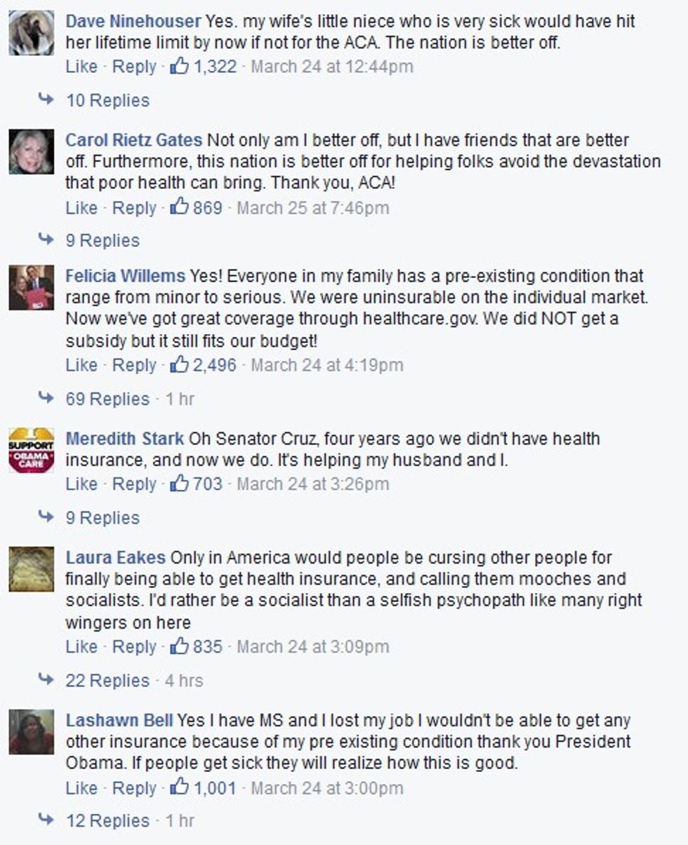 And so on. Page after page of people telling their own stories of how the ACA has helped them, with, of course, some replies from Ted Cruz fans calling them socialists and the problem with America. There's a comment from the owner of a small business who likes the ACA because