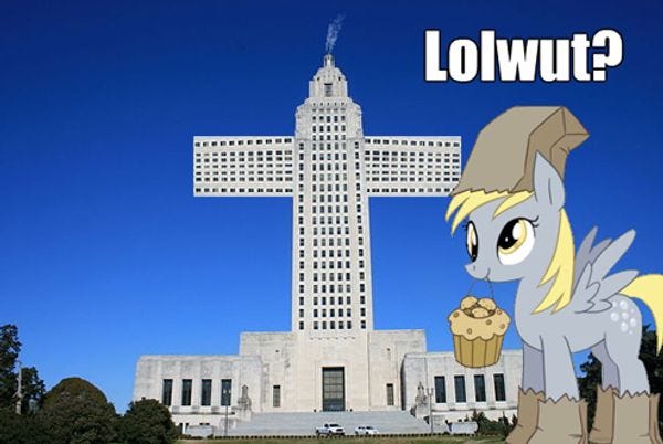 For the second week in a row, our Top Derp goes to a state looking to adopt a state symbol. Last week, it was South Carolina, where creationists blocked an adorable 8-year-old nerdgirl's idea to name the wooly mammoth the State Fossil. This week we have the Louisiana House, where a committee voted Thursday to move forward a bill to name the Holy Bible as the official State Book. In a bit of trivia, Rep. Thomas Carmody's original version of the bill would have named a particular copy of the Bible -- the oldest existing Bible in the state library system, printed sometime between 1510 and 1528 -- as the state book. But instead, Carmody introduced to the committee a new version that named the generic King James version. Not that he was promoting a particular religion or anything.