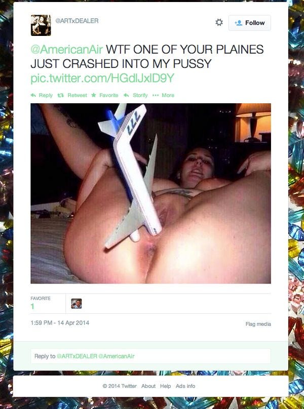 The likely cause of the corporate blunder was pieced together fairly quickly; not terribly long before the U.S. Airways tweet went out, someone had tweeted the picture (NSFW, remember?) to American Airlines with the message "WTF ONE OF YOUR PLAINES [sic] JUST CRASHED INTO MY PUSSY." The speculation was that U.S. Airways' now-jobless social media person copied the image -- possibly to send to a friend? -- and then, when posting what should have been a routine reply to a customer's complaint, mistakenly pasted the photo into their response instead of copying and pasting the link to U.S. Air's customer service desk. In fact, they did it twice -- the airline sent out two copies of the pic. Ouch.