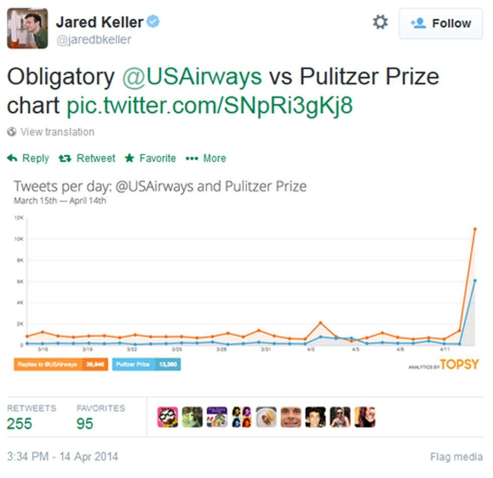Fortunately, someone had the presence of mind to compare Twitter traffic for the Aerovagoo and the Pulitzers, announced at about the same time: