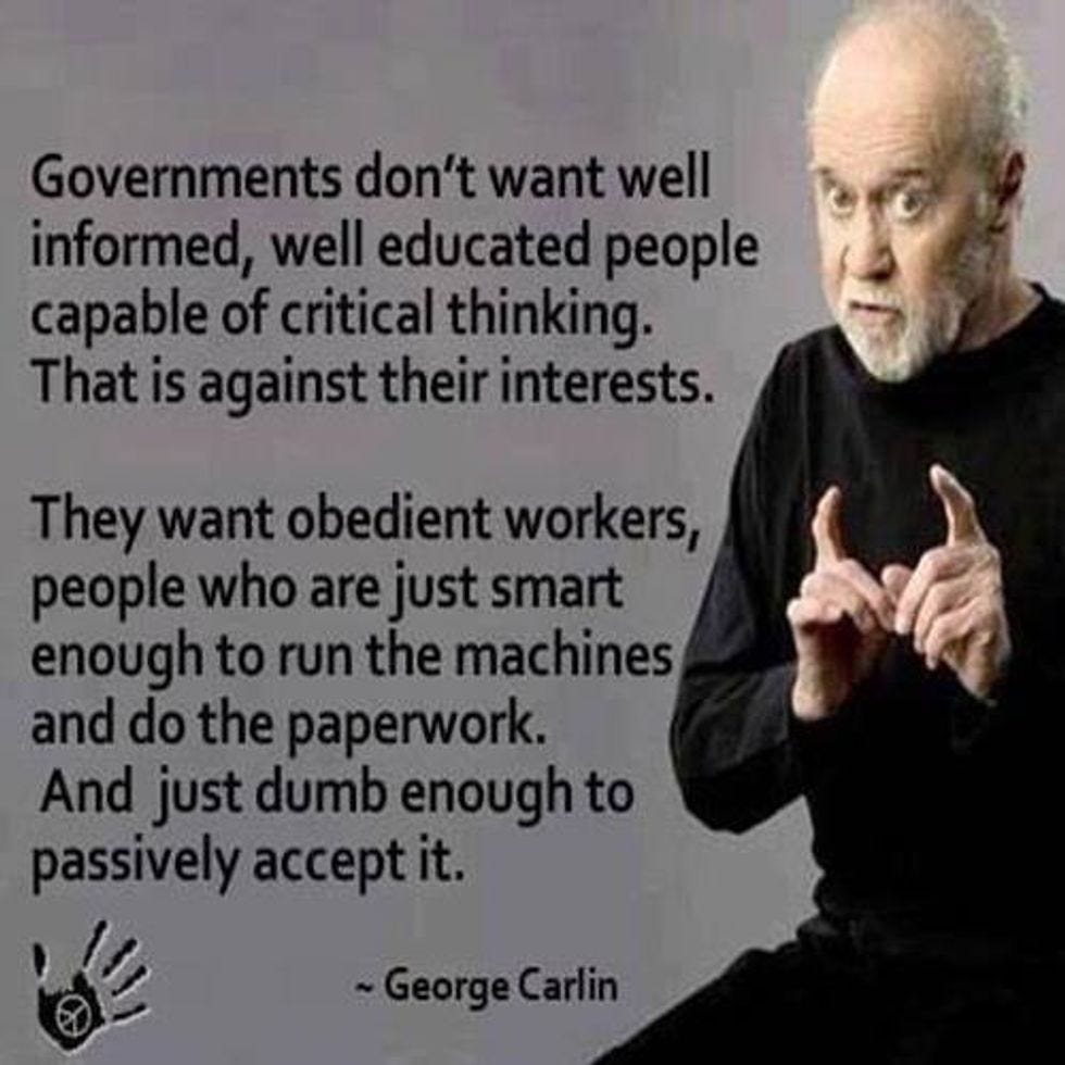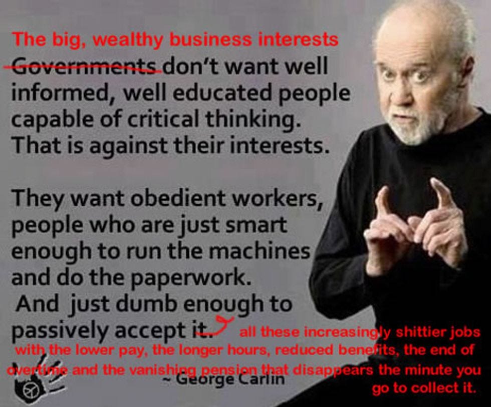 We won't reprint the full transcript that the Kos article provides; it's really rather impressive, though, that a group so dedicated to the very sort of anti-thinking agenda that Carlin rants about in the routine would use him as an avatar of corporate libertarianism. It's not even so much that the fake quote portrays Carlin saying "Governments don't want well-informed, well-educated people capable of critical thinking" instead of the actual "The big wealthy ibusiness interests don't want that" -- hell, the bit dismisses the power of government, not because government is evil, but because it was already fully purchased and neutered by the moneyed bastards under Reagan: