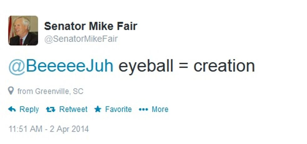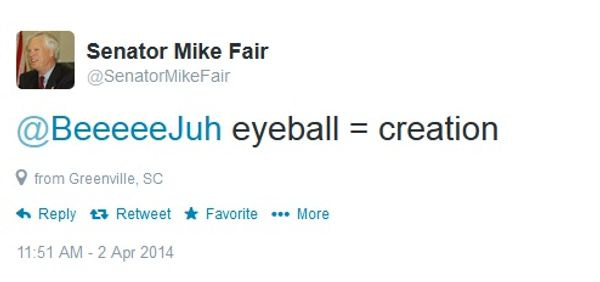 Oooh, evolution, YA BURNT! Ain't no way that the eye can be explained by evolution, unless of course you watched Neil deGrasse Tyson's reboot of Cosmos or read a little bit of science about exactly why the eye is a lovely proof of evolution -- and if anything, the human eye is a rather crappy adaptive compromise of an organ that evolved to see really well underwater, but is merely OK seeing through air. Not that Sen. Fair would find any of that more than clever speculation by people who hate God.