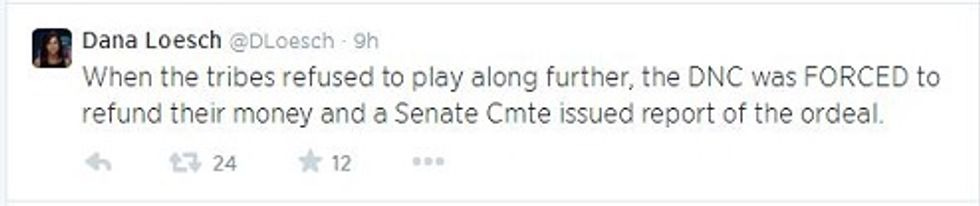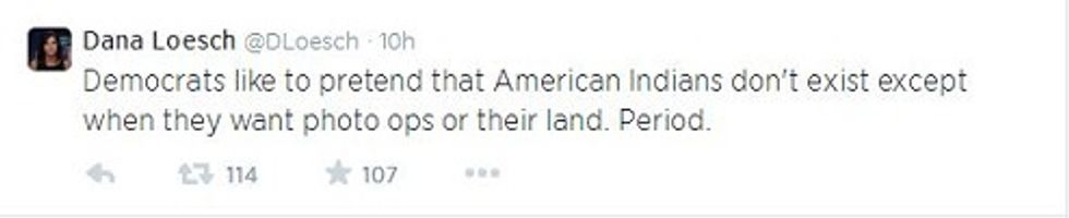 And conservatives don’t care about Native Americans except when they can use them as a cudgel to beat up on the Obama administration. Unless we have missed all of Dana’s past advocacy for Native American causes … nah, we’re pretty sure that hasn’t been a significant part of her career. Funny she hasn't cared about it before, since she also claims some Native American ancestry.