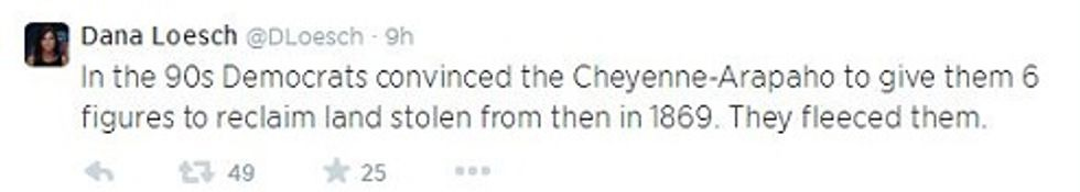 We had no idea what scandal Dana was talking about, so being the intellectually curious type, we did a little research. It seems that the Cheyenne and Arapaho tribes of Oklahoma have a long-standing claim to land that the U.S. government carved out of their reservation in 1883 to create the Fort Lee military base. The land was supposed to revert back to the tribes when the military was done with it, but the government kept finding excuses to not do so once Fort Lee closed down in the 1940s (its final use by the military was as a German POW camp in World War II). The tribes have been trying, with zero success, to reclaim the land for economic development, or at least for the rights to the large oil and natural gas deposits beneath it. In fact, back in 2006 conservative Oklahoma senators Tom Coburn and James Inhofe tried to screw the tribes by writing a bill (never passed) that would have required the Secretary of the Interior to lease the land to the oil and gas industry, which we’re sure would have upset Dana tremendously.