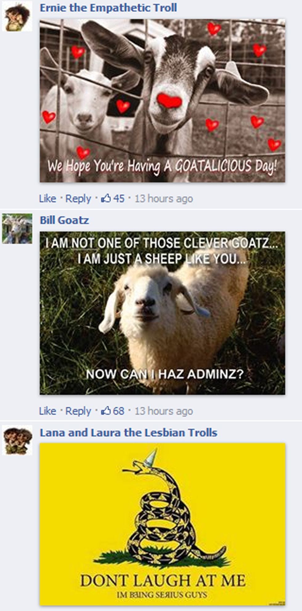 It would be inaccurate to call this "hacking," since that actually requires playing dirty with computer code; no, this is far simpler. Busta Troll simply hangs out on a wingnut Facebook for a while, pretending to agree with them, and then asks for administrator privileges (which is ridiculously easy), so he too can post cool anti-Obama stuff there. And then after he takes over, GOATS! The latest victim: a page called "Bowe Bergdahl is NOT a hero." It now offers a far more wholesome, goat-oriented discussion ofL'affaire Bergdahl. For Goat Justice.