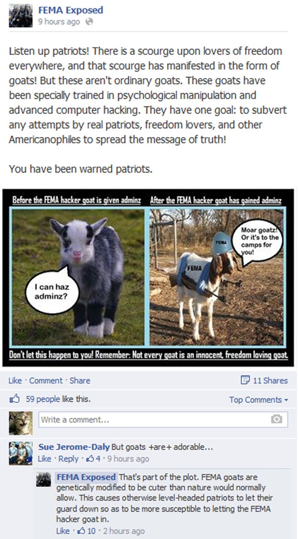 What's that, Goatz? You say you've also taken over a paranoid New World Order freakout page called "FEMA Exposed," which until recently was dedicated to this pile of derp?