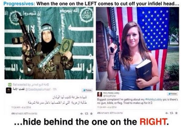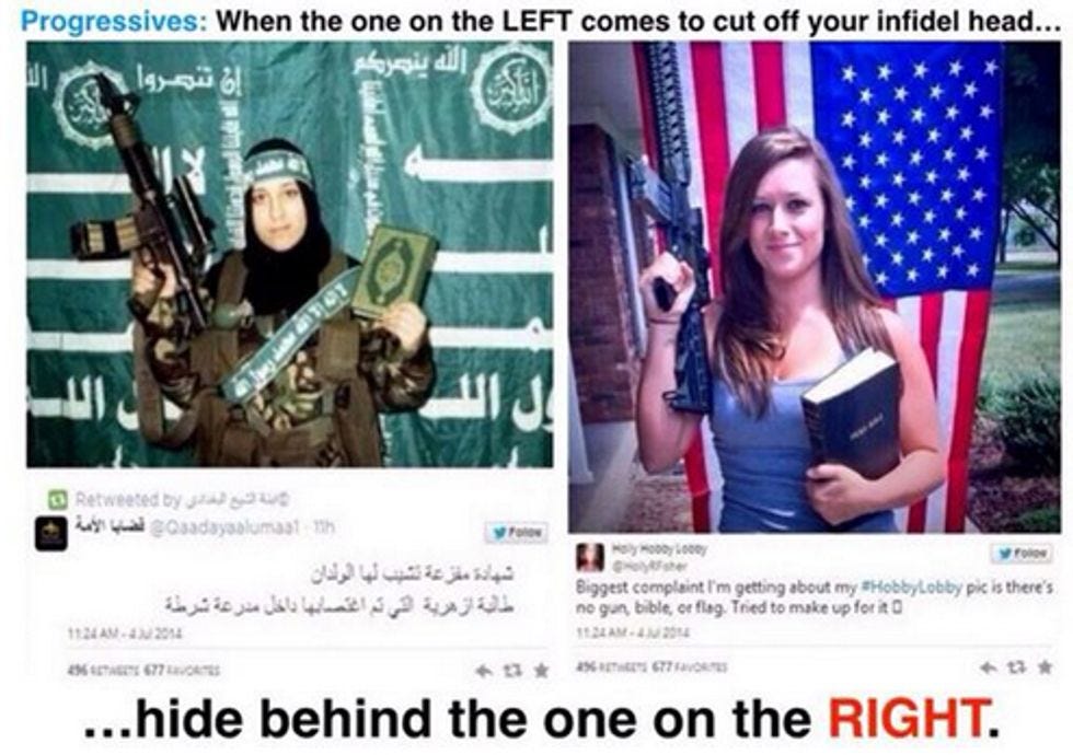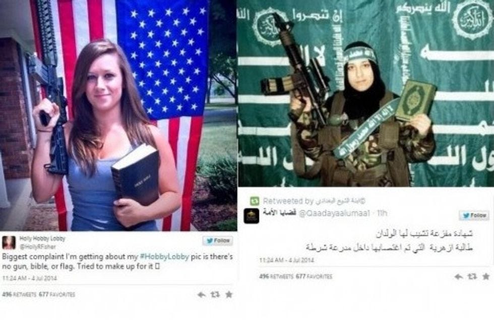 Also, Charles C. Cooke over at NRO knows exactly why the two pics are different: One is a deeply faithful patriot who is willing to do whatever is necessary to defend her country and her faith, and the other is a terrorist with no regard for human life. Besides, Cooke explains, while Muslim fundamentalists are violent extremists, Christian fundamentalists just don't do violence. In reply to Patheos blogger Michael Stone, who noted a violent strand of rhetoric in the Christian right, Cooke says,