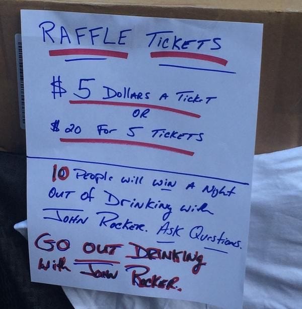 Yes, you saw the hand-scrawled sign. No, it was not written by a child or a homeless person in haste. It was written by John Rocker and contains the rules for how you win the biggest bestest John Rocker prize. Five dollars per ticket! Or scale up and drop $20 for five tickets. BARGAIN. Ten lucky people that throw down their stupid-earned money will win a night out drinking with John Rocker. Okay, actually, had yr Wonkette known about this blessed event, we might have thrown down some coin, if only we could ask him about his thoughts and feels about guns and black people. On second thought, that's a night that would end with us punching John Rocker straight in the mouth, which is a problem because we are a nonviolent sort of people.