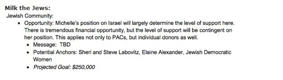 And of course, we're supposed to be shocked, shocked that a campaign document directly suggests fundraising from the Jewish community, because why is Michelle Nunn engaging in such terrible stereotyping of Jews as rich, huh? It is just unthinkable that a campaign would give any consideration to such things. Besides, even though Jews overwhelmingly vote Democratic, it is a well-known fact that Republicans love Israel and Democrats do not, so this is just more evidence that Jews are being played for patsies, or schlemiels, or something Jew-sounding. (Do those people even drink milk?)