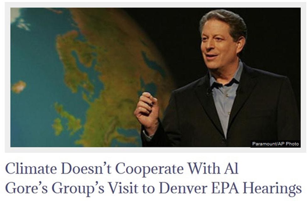 The dumb story tried to suggest that it was pretty darned embarrassing for Gore's Climate Reality Project to show up in Denver for EPA hearings with "'I’m Too Hot' trucks and offers of free ice cream" on a day when the morning temperature was "a chilly 58 degrees. Plus, it was raining." Hahaha, stupid warmists, you can't even get the climate to cooperate with you!