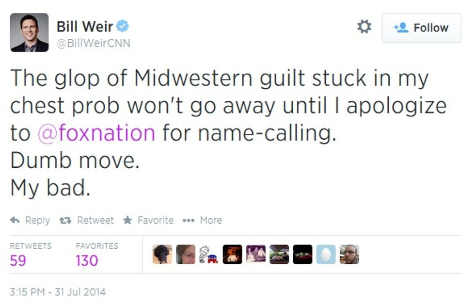 Weir apparently felt a bit of "Midwestern guilt" over the first tweet and sent an apology -- for the language only, not the sentiments: