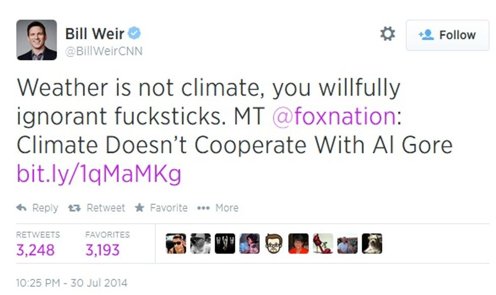 A special bouquet of greenhouse flowers goes to CNN anchor Bill Weir for the perfect reply to climate change deniers, please. You see, Weir was not terribly impressed with this Fox Nation story (aggregated from the Washington Times ) that mocked Al Gore for attending a climate change meeting in Denver on a chilly, rainy day, because if it's rainy and cold during the summer, then climate change is a myth, right?