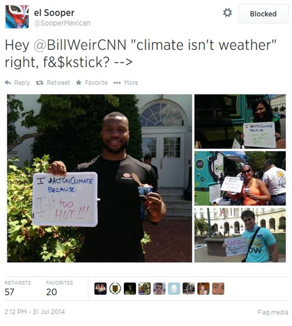 And as proof, they offered this brilliant reply to Weir, using twitter photos of Climate Reality Project supporters to prove that hot weather doesn't prove global warming either, so nyeah nyeah nyeah: