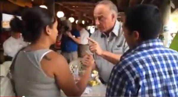You should watch the whole thing. You really should. The part where he asks her if she's a drug-smuggler. The part where he asks her, AGAIN, if she understands English. Duh, Steve, she's speaking to you in English, isn't she? Doyouunderstand? The part where he insists the "liberal left" takes all of his hatred out of context, that when he talks about the evil brown not-Americans, he is ONLY talking about the evil drug-smuggling ones. Not the ones like Erika, the ones who've grown up here and graduated from college and yes, STEVE, they speak English.