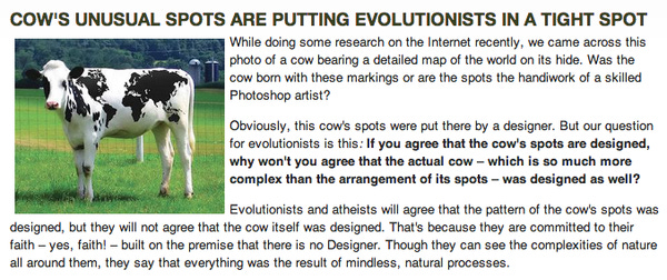We are having a hard time coming up with an answer to their noggin-scratcher, mostly because of how we stopped reading. We also have a hard time coming up with "what part of this cow-spot Intelligent Design thingy is a special offer for WND readers," unless it is the "free church bulletin inserts" which, woof, dudes. Maybe it is the special offer of a daily email? Somebody should probably sign up for that. Dok is nominated, I second, the vote stands. Somebody sign Dok up for his daily Creation Moment, k thx.