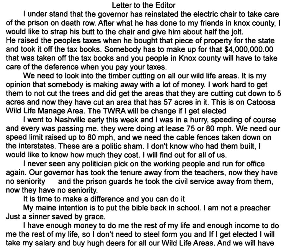 Here is one possible letter to the editor, unless some asshole is signing Chrles Brown's name to stupid letters again. As you can see, he forgot to add "with votes."