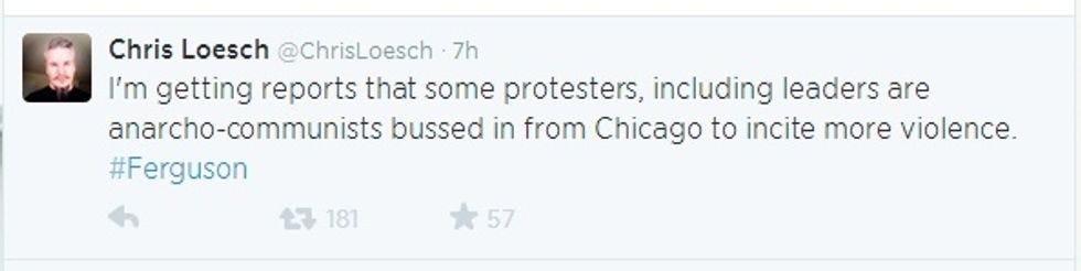 Let us help you a bit in your interaction with fact-based reality here, Mr. Loesch. Maybe there are some people from Chicago, anarcho-communist or non, who came to Ferguson because what happened in Ferguson happens everywhere and someone in Chicago who cares about other human beings might feel empathy and outrage and want to come and stand with the people in Ferguson. People in Chicago -- who do not in fact live in Ferguson, or even in Missouri -- might care about abuses perpetrated by police that they themselves do not have to live with in their immediate surroundings. We understand this might be a hard concept to grasp if you are a terrible person who thinks the natural state of people is to think only of themselves.