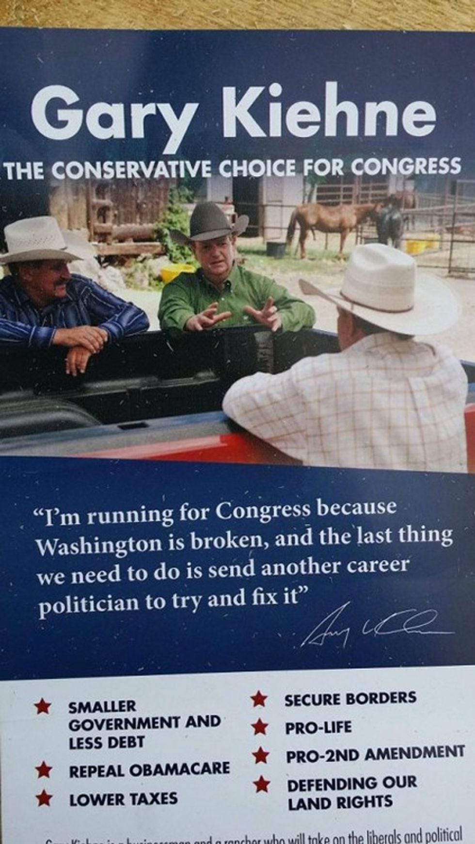 In a midterm election that's featured Joni Ernst winning the Iowa Senate primary based on her professed expertise at castrating pigs and Thad Cochran reminiscing about his boyhood adventures in molesting animals, it's probably no surprise that Arizona teabagger Gary Kiehne recently mailed out a campaign flyer with a very happy stallion in the background, much to the delight of the goofballs on Reddit, because duh, horse cock.
