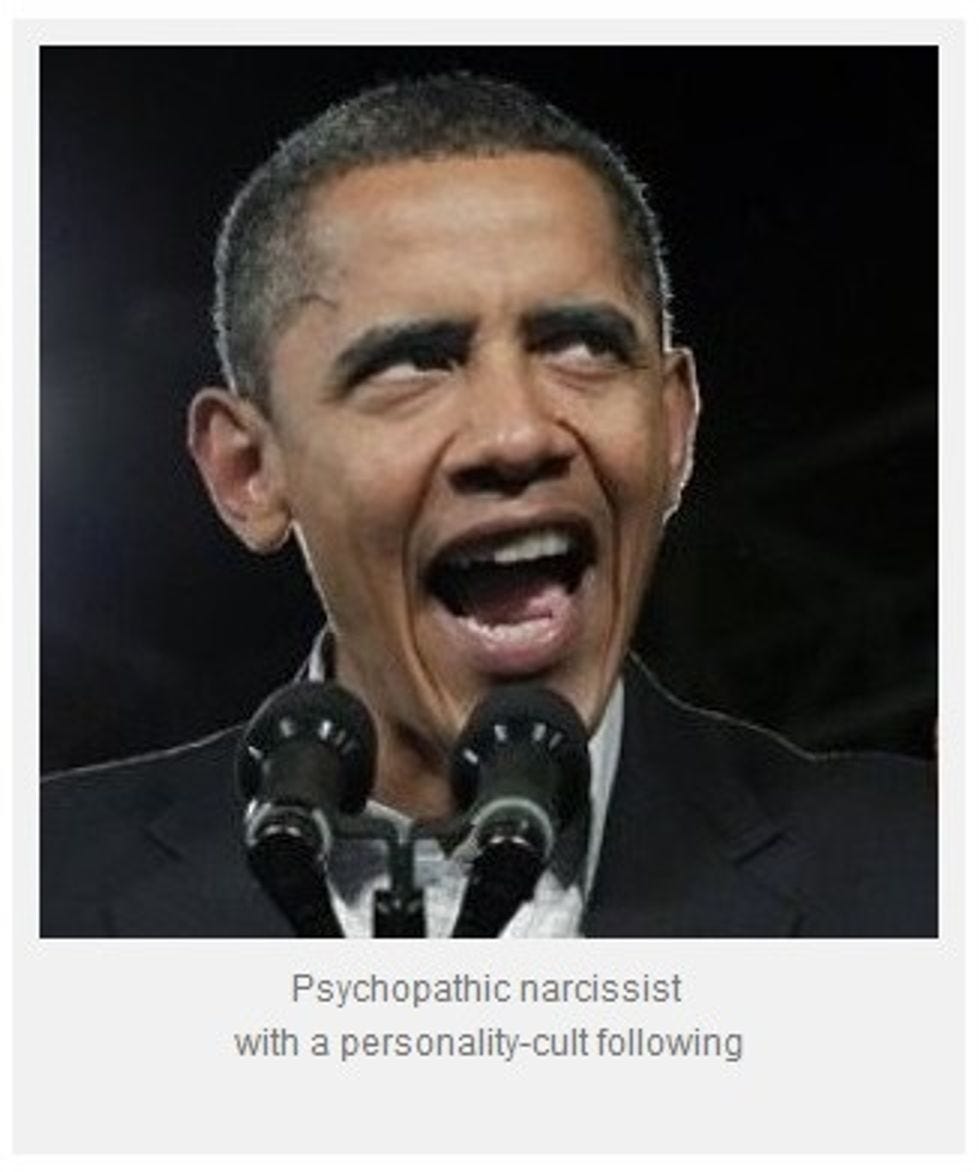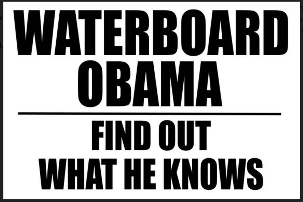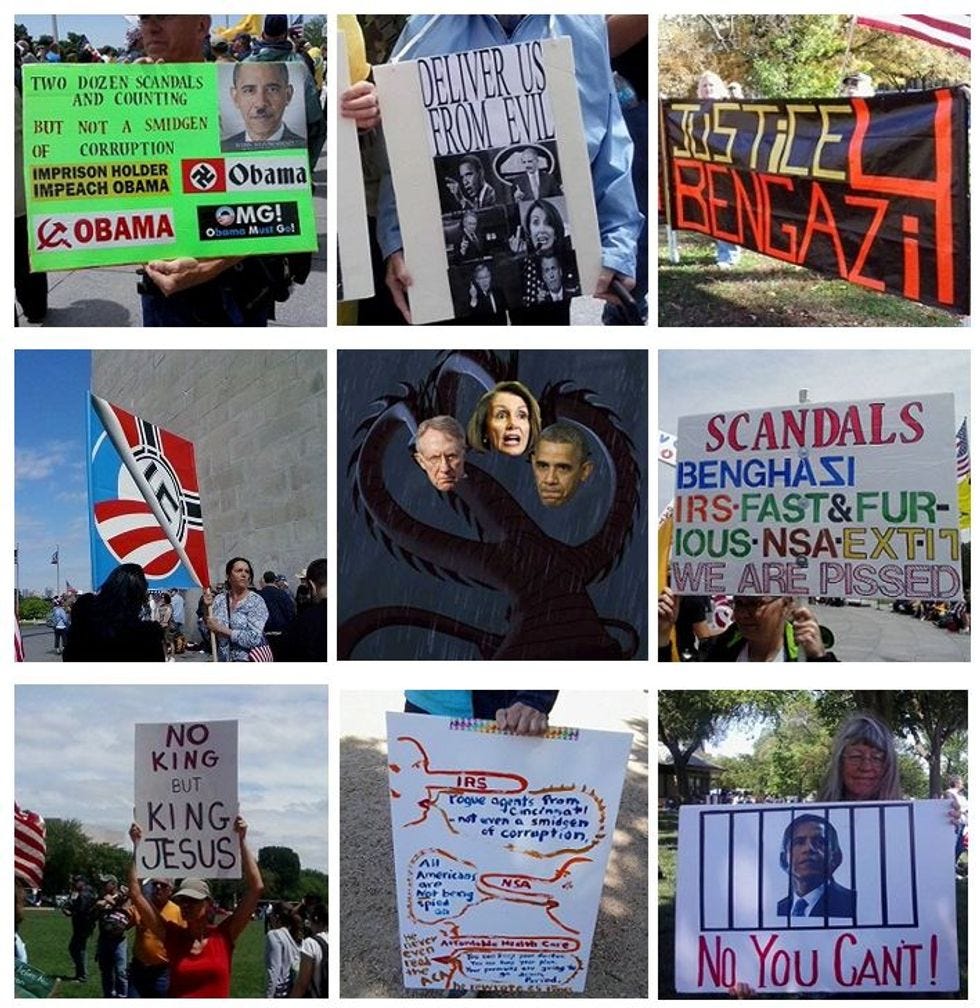 While you're out mingling with your fellow defenders of the republic, you can check off these classic anti-Obama signs from your Impeachment Party Bingo Card. The ObamaReidPelosi-headed Hydra in the middle square is, of course, the Free Space.