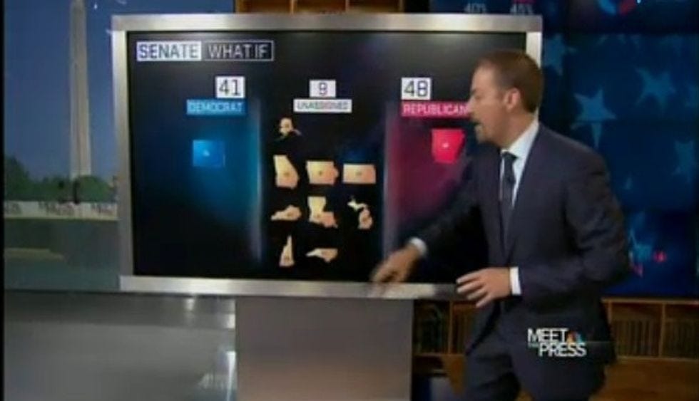 Chuck Todd is so excited, you guys! It's his first week as the new host of Meet the Press. That other guy with two first names failed his way into a $4 million buyout and NBC, looking to bring back the powerhouse once steered by Tim Russert, took the opportunity to slip Tim's son Luke and Morning Misery Joe Scarborough in along with Chuck to lend the proper gravitas. We couldn't wait to see Chuck's debut Sunday morning, by which we mean we slept in and caught the late rerun.