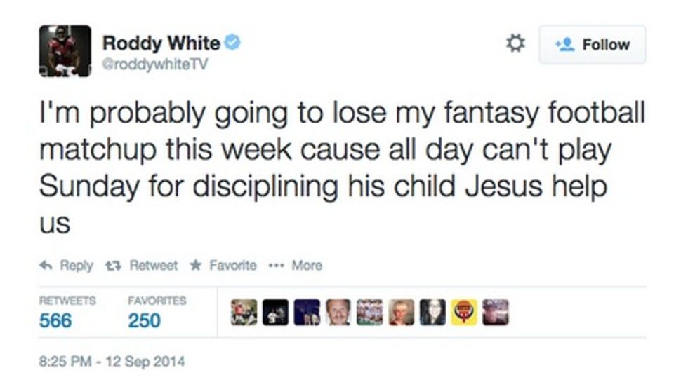 Then of course, there's the Second Worst Possible Reaction of all to the story: Atlanta Falcons receiver Roddy White, who you'd think would be too busy with actual f'ball to be worried too much about fantasy f'ball, tweeted Friday in response to Peterson's being sidelined: (deleted, of course, but captured for posterity by CBS sportswriter Will Brinson):