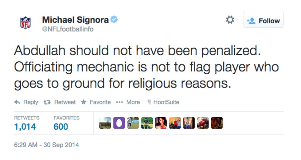 We are quite surprised that the NFL quickly condemned the decision to penalize Abdullah with this lengthy condemning condemnation by NFL Vice President of Football Communications Michael Signora: