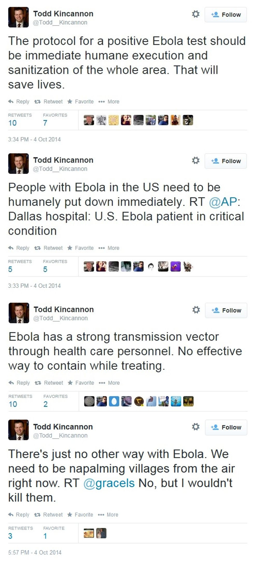 Former executive director of the South Carolina GOP, Trayvon Martin clairvoyant, ethics-free attorney, and avid penis self-photographer Todd Kincannon is proudly pro-life -- with one exception, of course, in that he wishes Wendy Davis had been aborted. But he also recognizes that sometimes, in the face of a serious health crisis, you just need to man up and kill everyone who's been infected or exposed. At Wonkette, we are sometimes given to exaggeration. But this is not an exaggeration: in a series of tweets on Saturday, Todd Kincannon, not satisfied with rightwing prescriptions like travel bans or embargoes on affected nations, literally advocated killing all Ebola patients, and napalming their villages for good measure, too. And we mean literally literally, not Joe Biden literally: