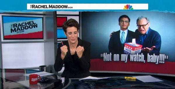 You know who else is mad enough to swear? Lewis Black, who's now starring in an ACLU campaign to raise awareness of voting restrictions. He's pissed, and he's wonderful, and the ACLU's video is included in this Maddow clip.